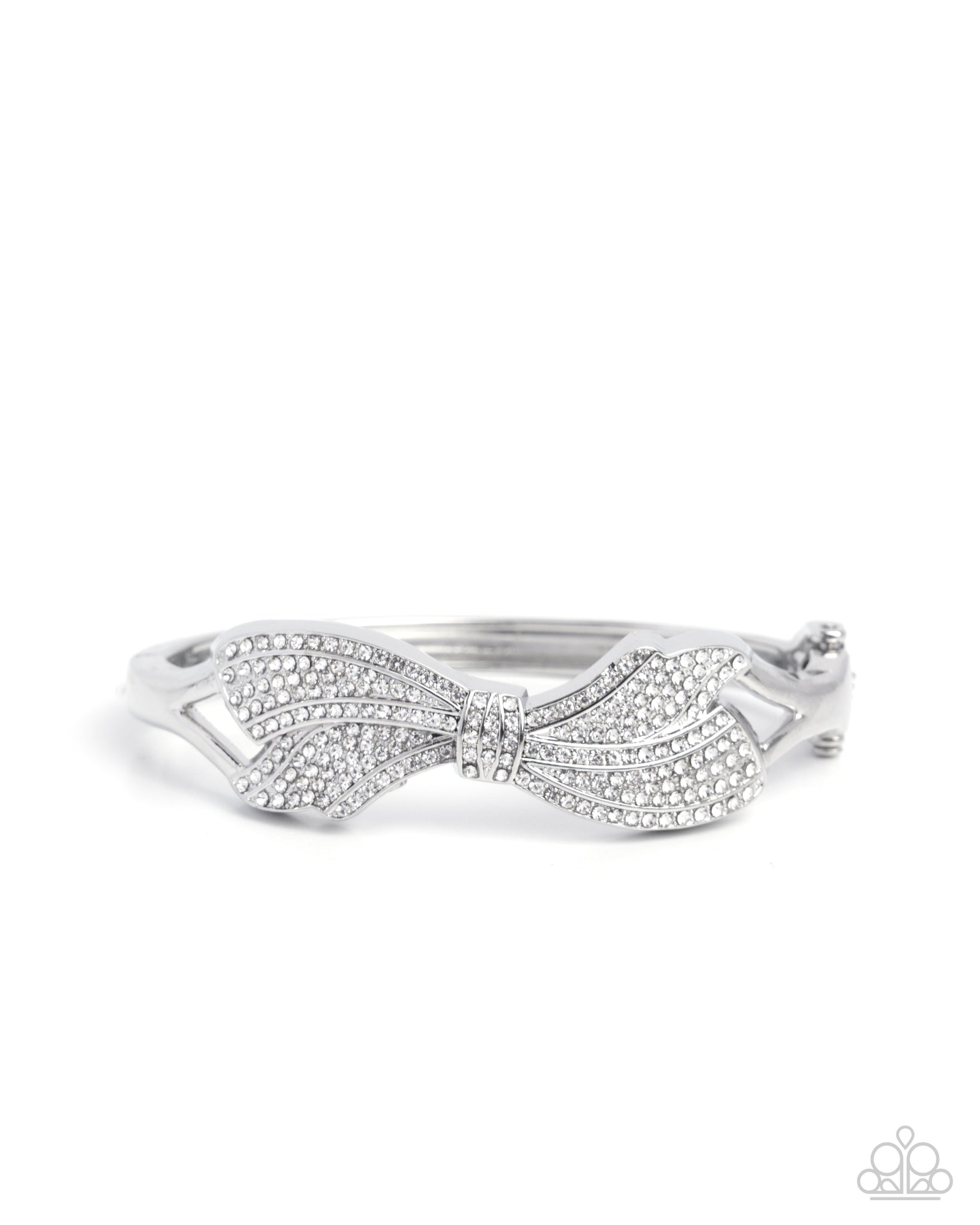 Dusted in white rhinestones, ribbons of silver curl into an oversized, airy silver bow that glitters at the center of a glistening silver cuff for a touch of class and refinement. Features a hinged closure.