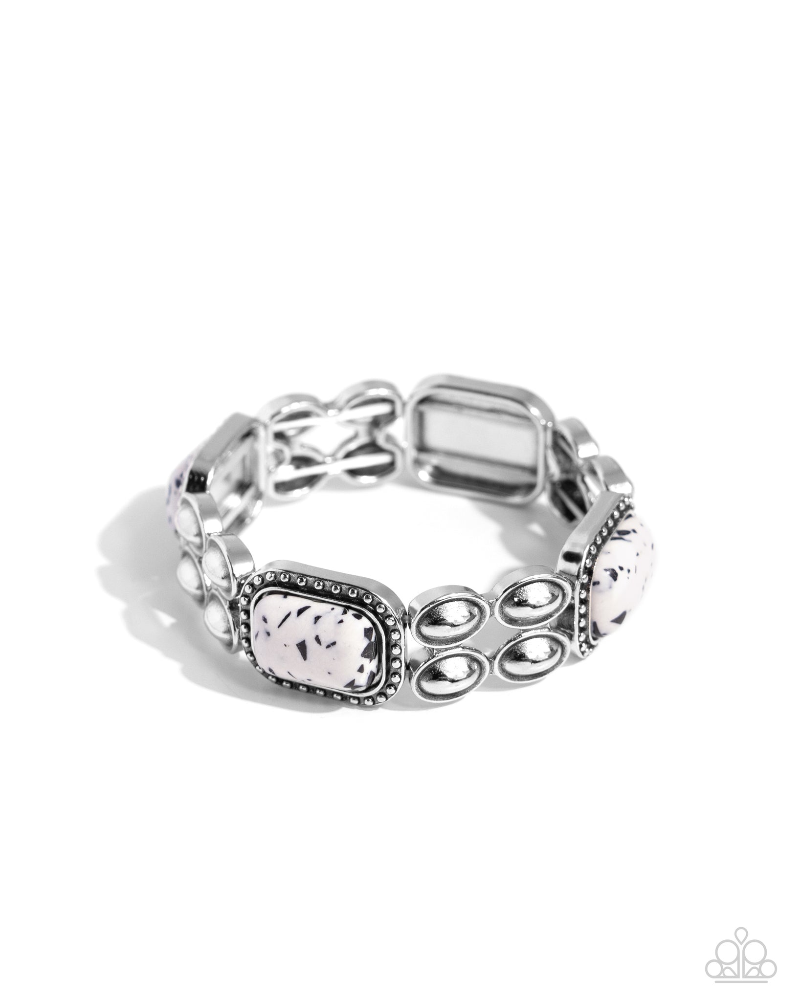 Infused along an elastic stretchy band, a quartet of silver ovals set in an airy frame alternate with white-and-black marbled stones pressed in a rectangular, silver-studded frame for a simply stony statement. As the stone elements in this piece are natural, some color variation is normal.