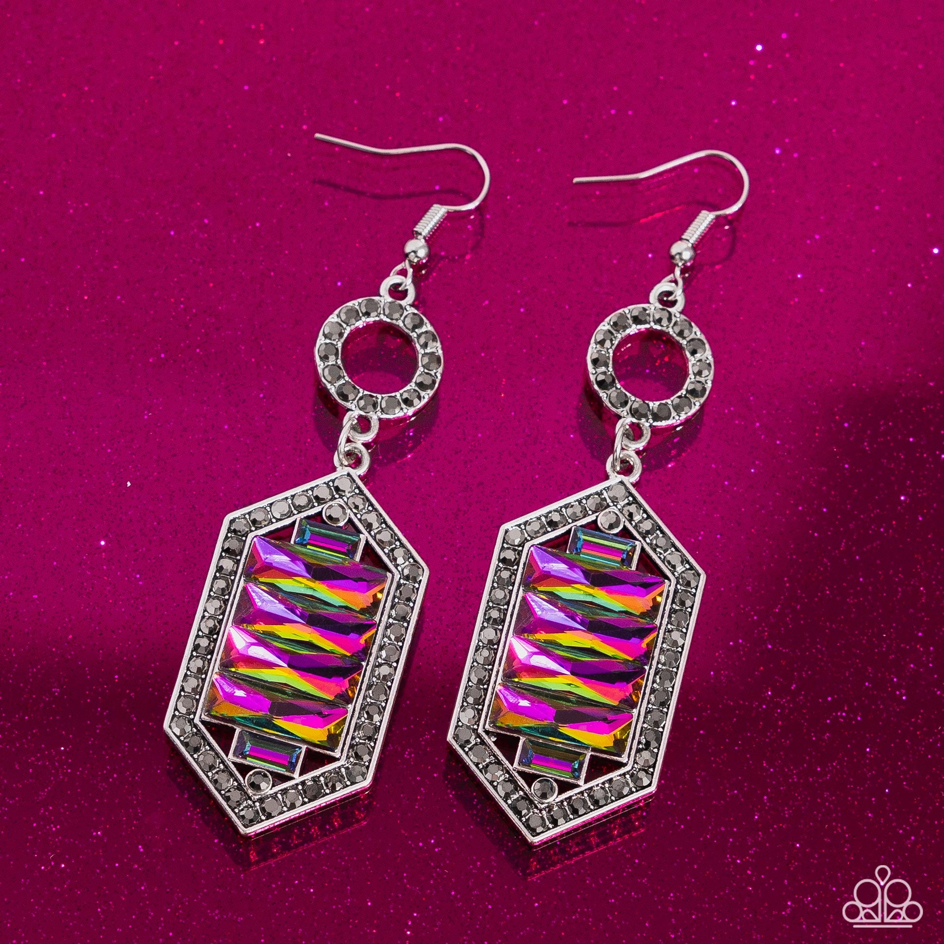 Encrusted in hematite rhinestones, an elongated silver hexagonal frame folds around row after row of faceted emerald-cut oil spill gems. Two smaller emerald-cut oil spill gems and hematite rhinestones border the larger emerald-cut gems showcasing their exaggerated size. The glitzy hexagonal-shaped frame is suspended from a hematite rhinestone-encrusted silver ring, finishing off the design with additional edge and sheen. Earring attaches to a standard fishhook fitting.