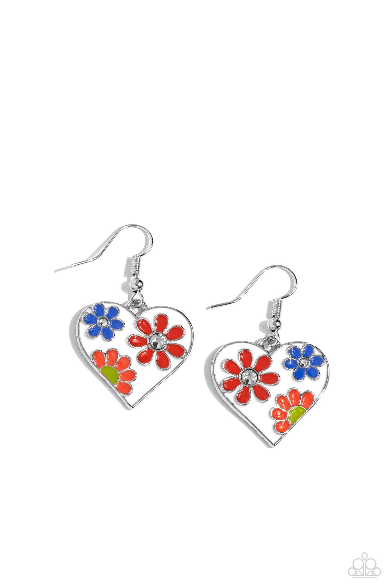 A colorful floral pattern of Burnt Sienna, coral, and Persian Jewel flowers with white rhinestone centers, and a Leek Green center is painted across the front of a white-painted heart backdrop, creating a colorful statement lure. Earring attaches to a standard fishhook fitting.