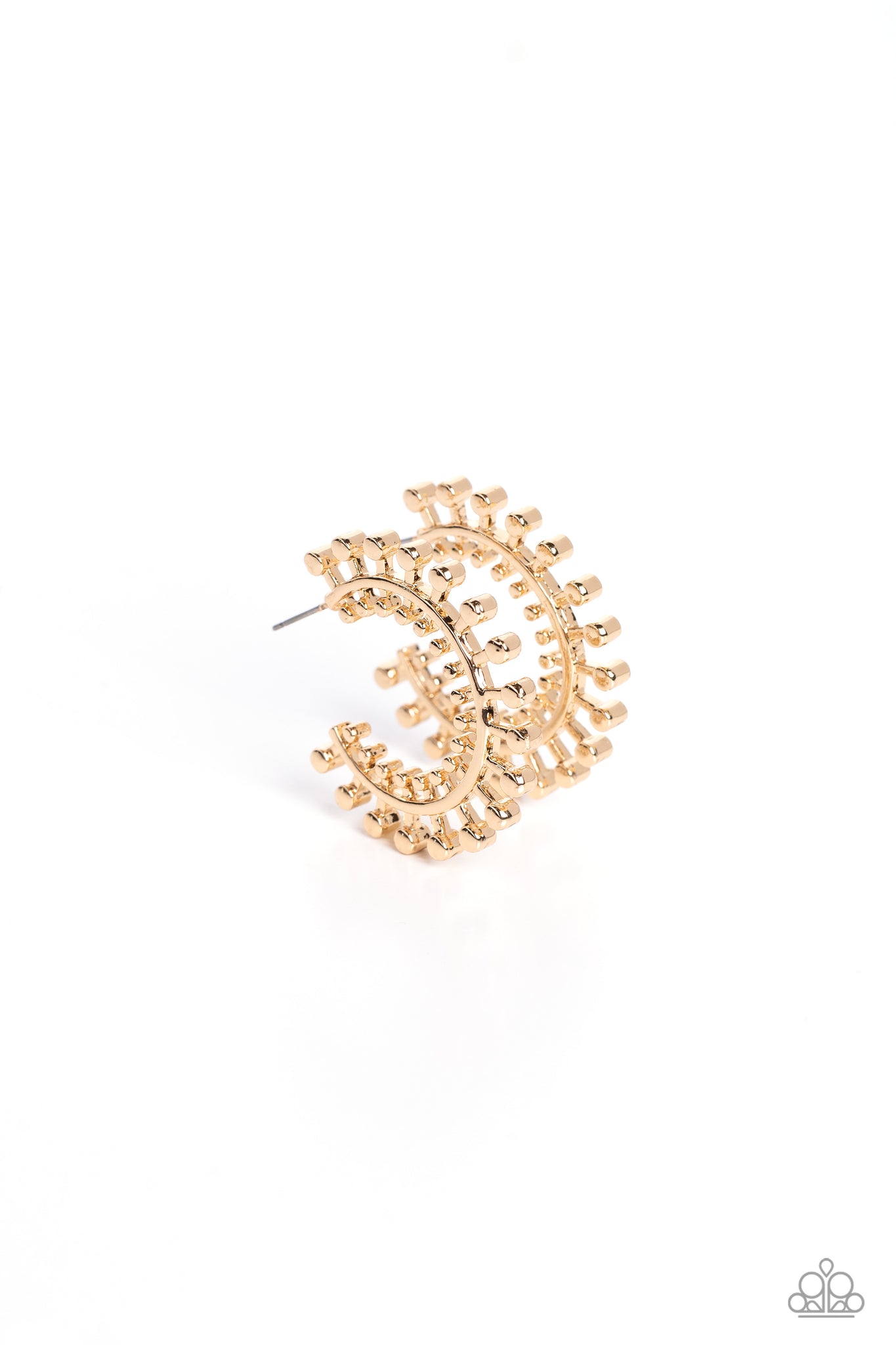 Tactile gold studs fan out along a classic gold hoop, erupting into a brilliant display of texture and sheen. Smaller studs line the inner edge of the hoop, adding additional eye-catching detail to the adventurous design. Earring attaches to a standard post fitting. Hoop measures approximately 1 1/4" in diameter.