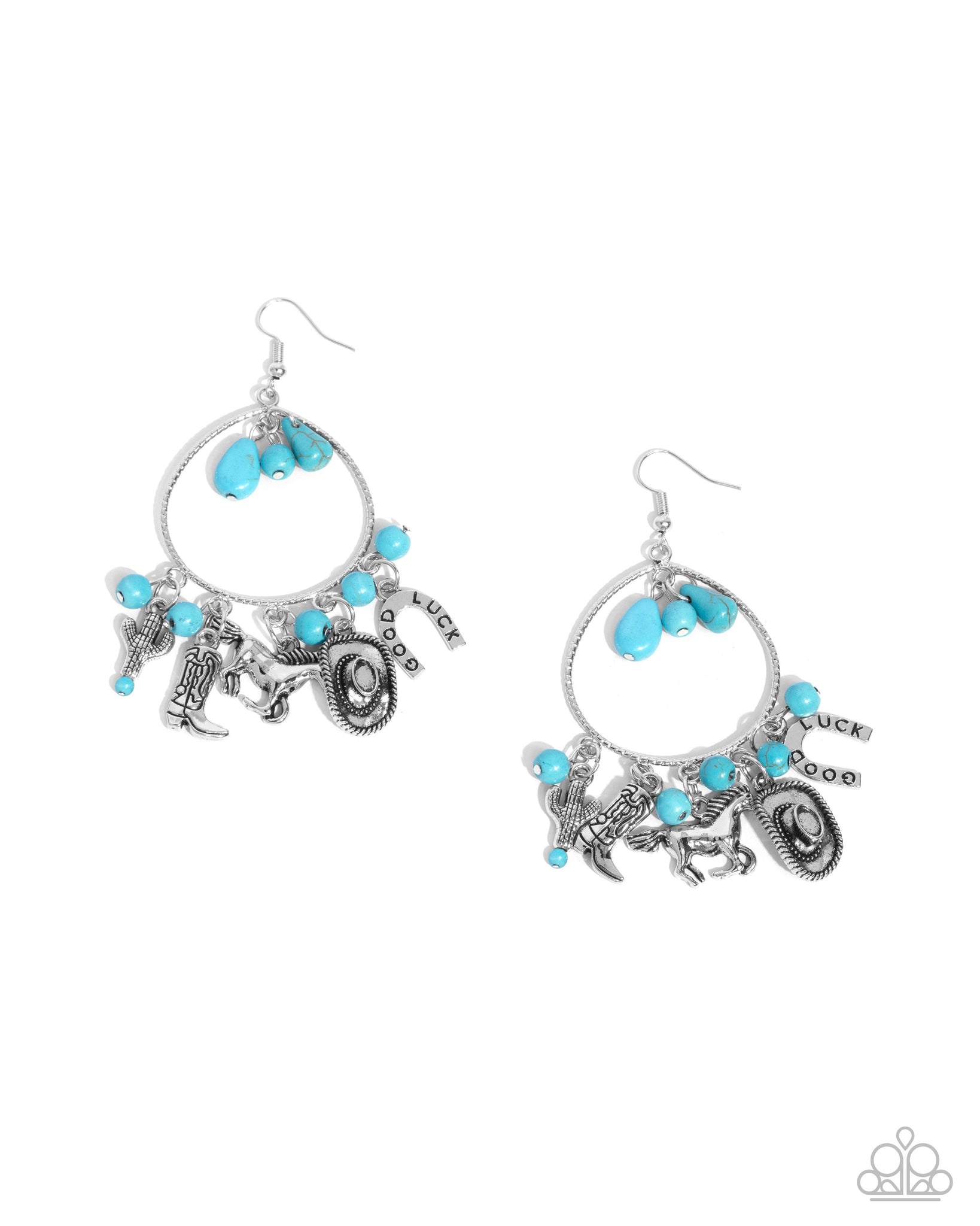 Featuring round and teardrop shapes, marbled turquoise stones dangle from the top of an oversized, textured silver teardrop frame. Additional round turquoise stones join a collection of silver cowboy chic charms including a textured cactus, a detailed cowboy boot, a wild stallion, a textured cowboy hat, and a horseshoe stamped with the phrase "Good Luck" that sways from the bottom of the frame for a glamorously Western fringe. Earring attaches to a standard fishhook fitting. As the stone elements in this piece are natural, some color variation is normal.