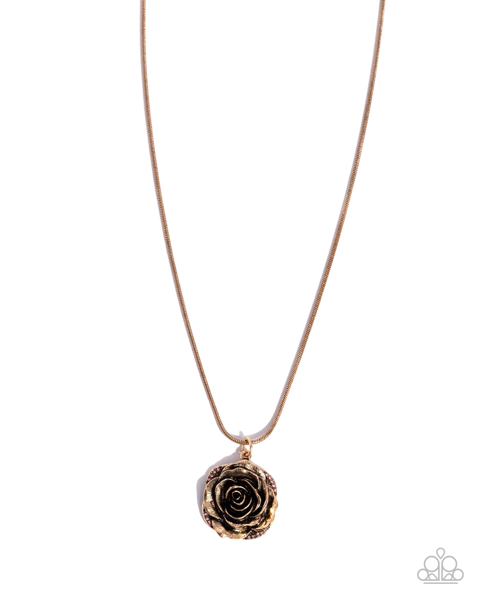 Gliding along an antiqued gold snake chain, a three-dimensional, oversized antiqued gold rose glistening with etched texture blooms below the neckline for a whimsical display. Gracing the outer crimped petals, a collection of dainty rose rhinestones glistens for a shimmery finish. Features an adjustable clasp closure.