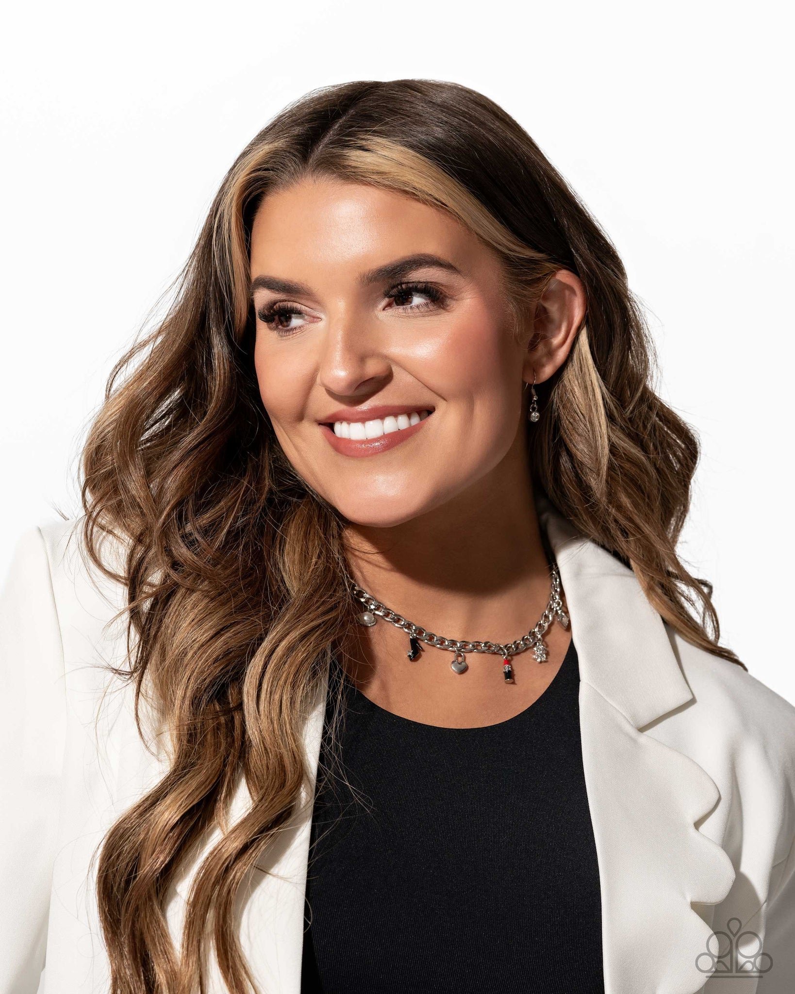 Dancing along a silver curb chain, a collection of trendy charms including a heart lock, a black white-gem embellished high-heel shoe, a red lipstick tube embellished with white rhinestones, a pearl pressed in a serrated frame, a silver rose, a solitaire white gem in a diamond frame, and a silver swan creates a shopaholic statement below the neckline. Features an adjustable clasp closure.