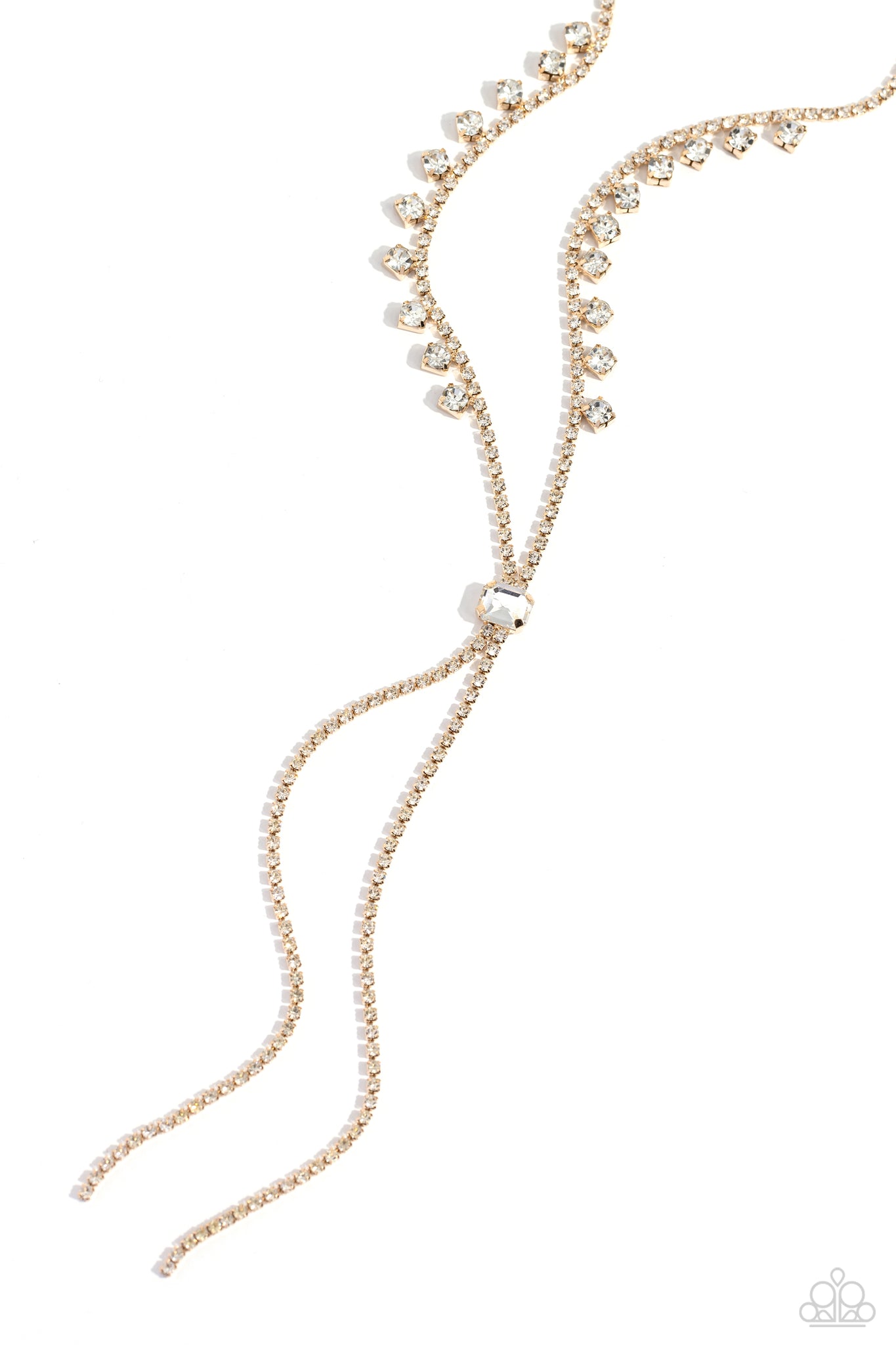 Attached to a section of dainty gold chain, white rhinestones, pressed into shiny gold box chain fittings swing down the neckline in a lariat-like manner for an effulgent glow. Sporadically dancing along the box chain, exaggerated white rhinestones in solitaire square fittings adorn the sparkly display for additional refinement and class. An emerald-cut white gem rests along the decadent display, separating the white rhinestone chain into two strands, creating a dazzling statement. Features an adjustable clasp closure.