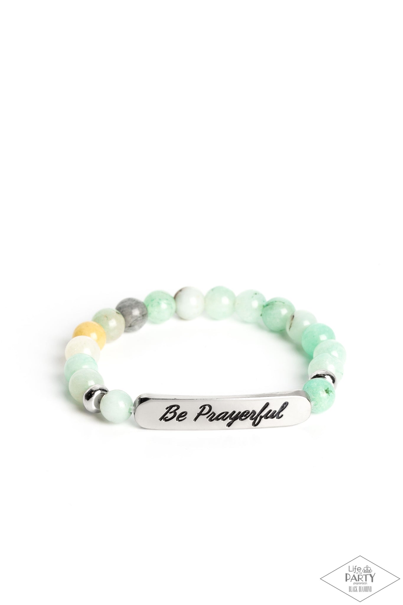 Infused with dainty silver accents, a collection of glassy green stone beads and a shimmery silver frame stamped in the phrase, "Be Prayerful", are threaded along a stretchy band around the wrist for an inspirational look. As the stone elements in this piece are natural, some color variation is normal.